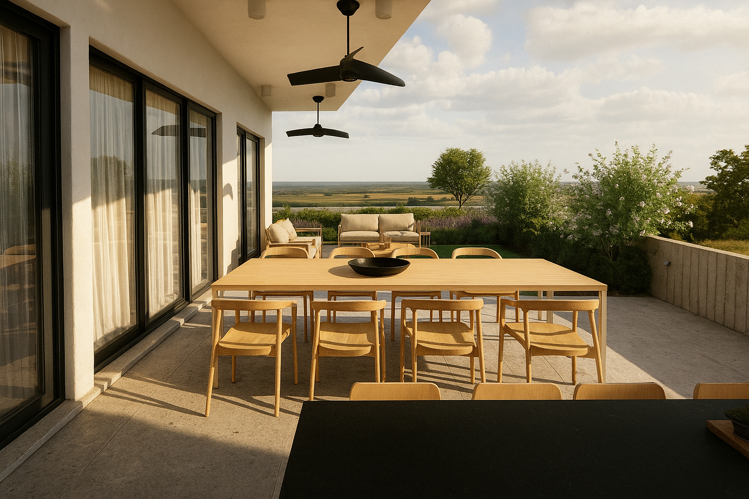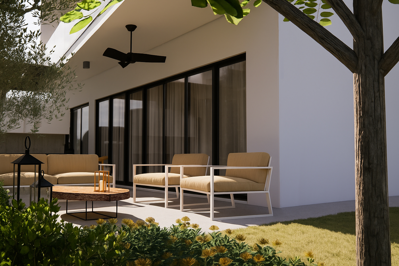 Large, covered lounging areas outside with garden views